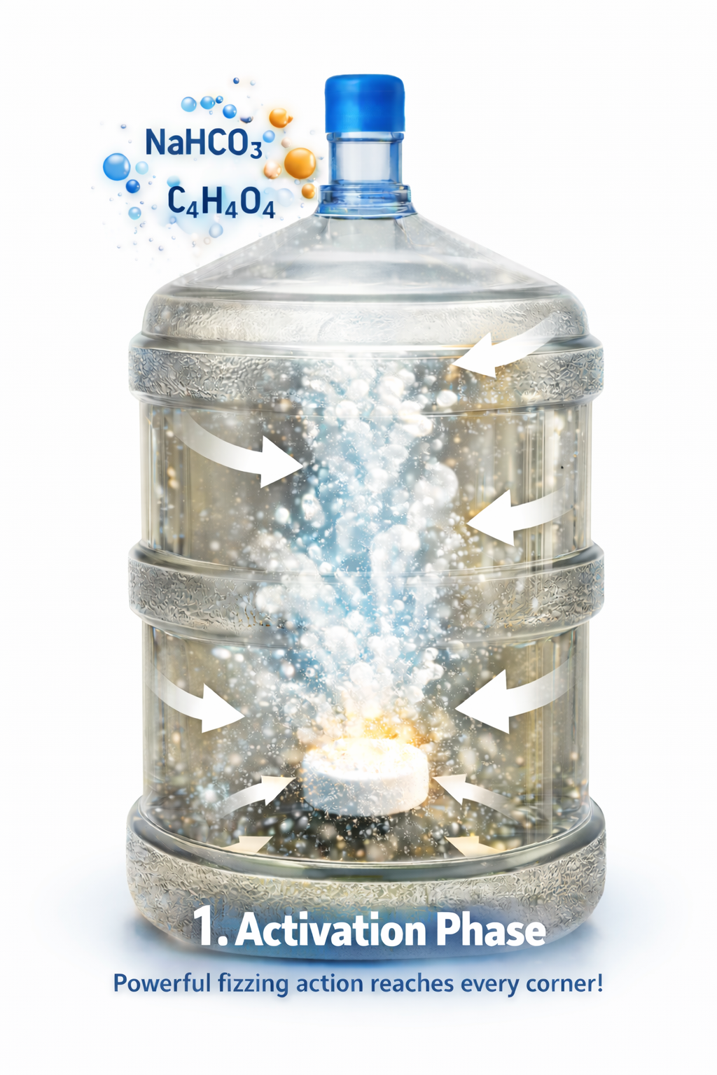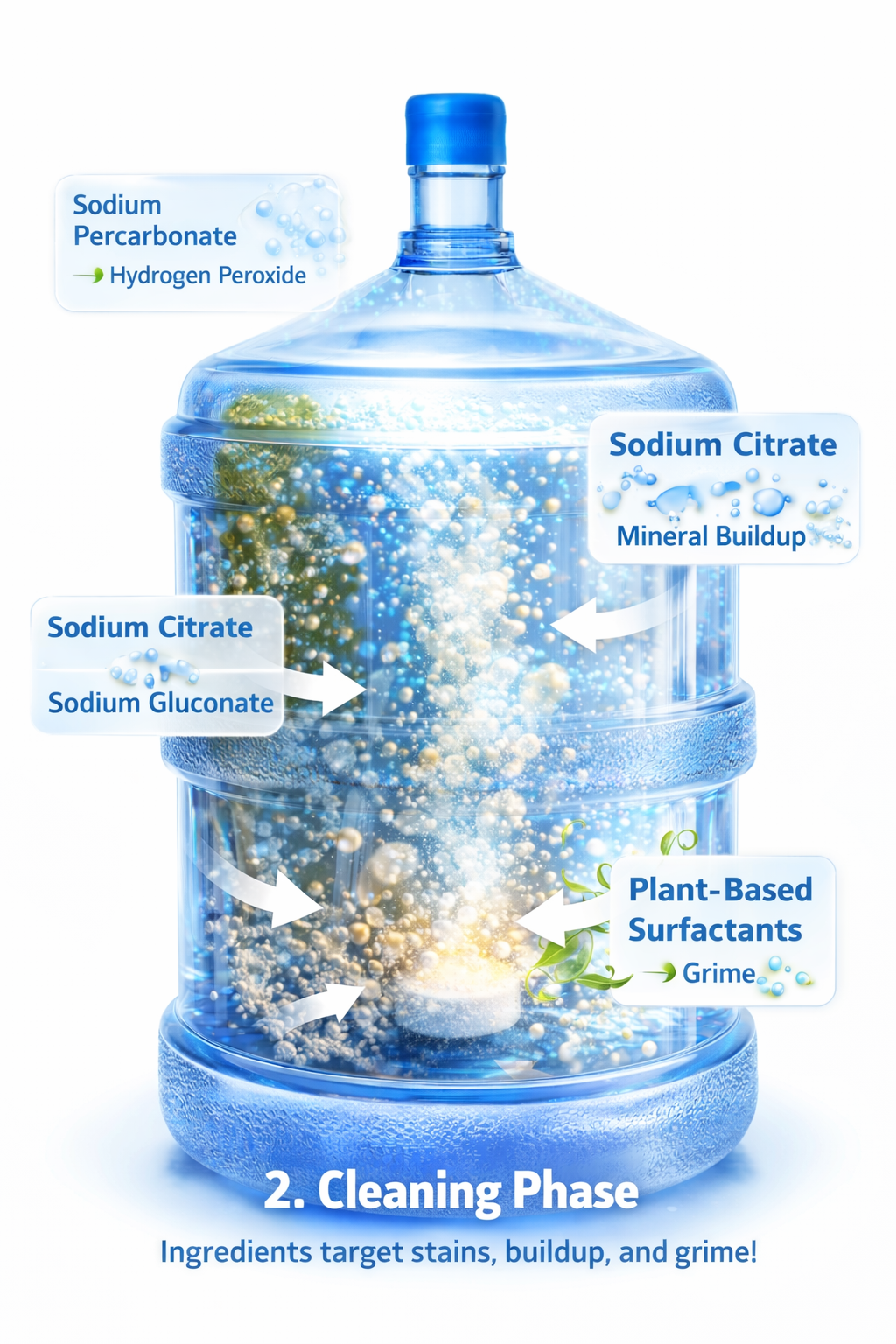 This reaction generates micro bubble agitation that distributes the cleaning chemical reaction throughout the entire jug reaching tight necks, corners, and hard-to-access internal surfaces without heavy scrubbing.